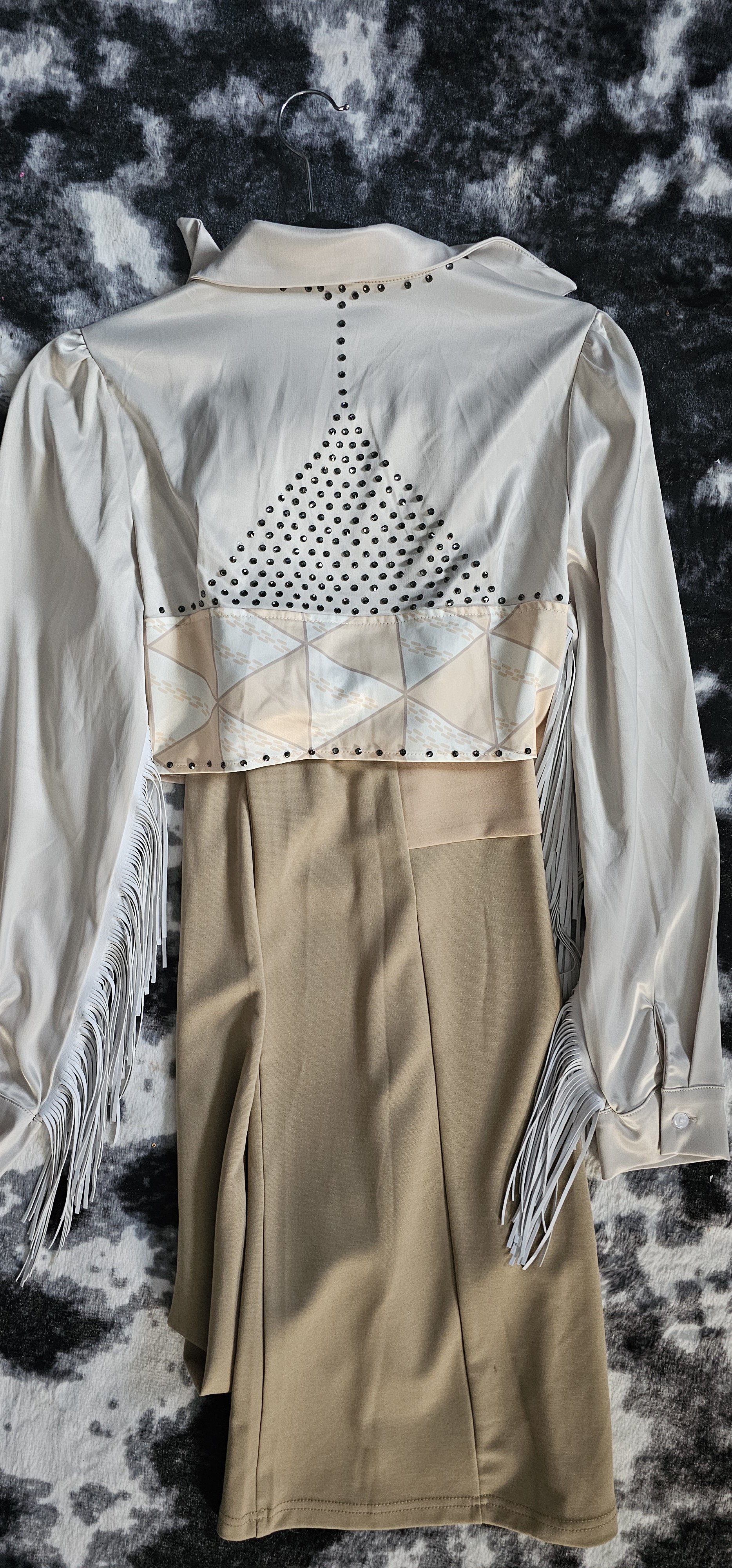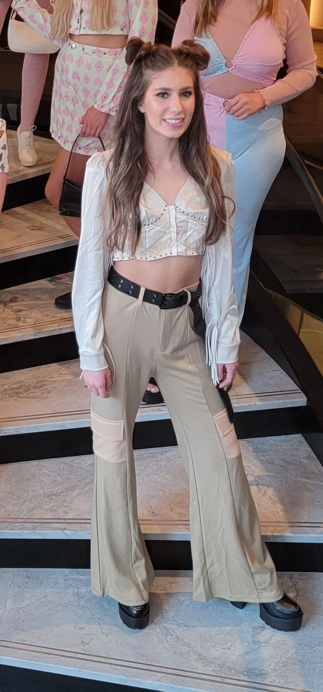 This 2 pc set is a little yee and a little rock - crop satin top with feminine lines with leather fringe and rhinestones paired with cargo style bell bottom pants that are so comfy yet on trend.