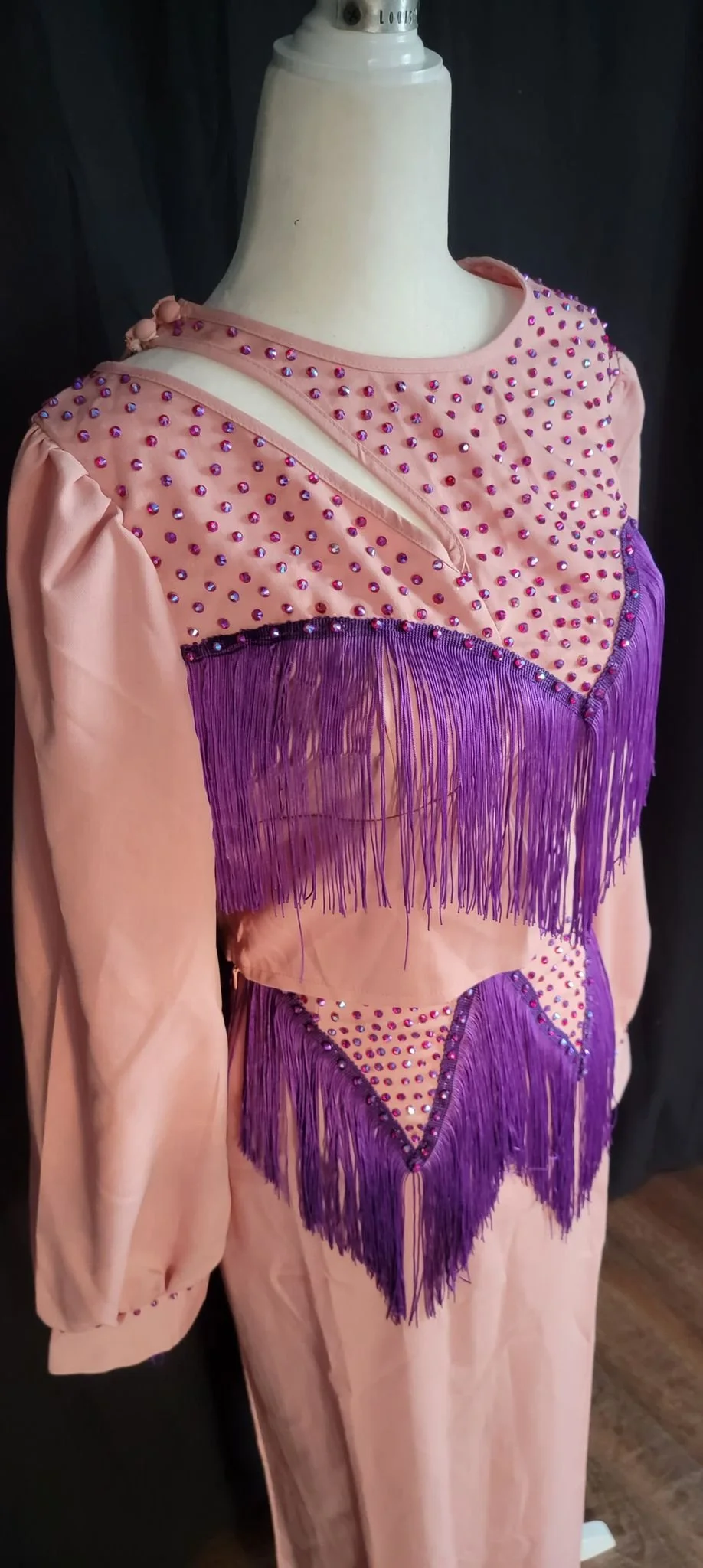 This two piece monochromatic skirt set is AMAZING! Peach base with purple fringe and color changing rhinestones that are super eye catching! With a dash of old timey western yokes and a modern neckline- this piece is so much fun- from Rodeo nights to office meetings, this piece will surely be a fun splash to your wardrobe.